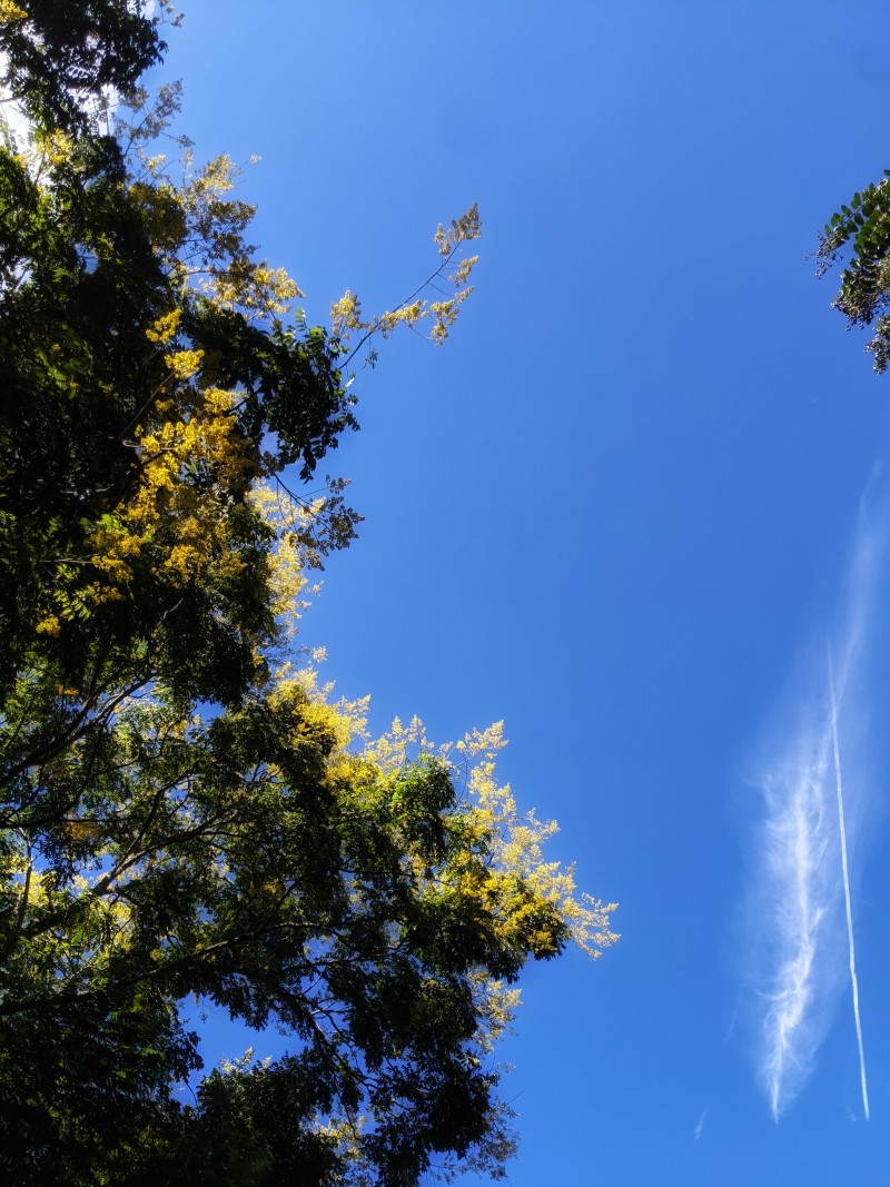 Picture for the Mondaze is an example of how the weather is behaving with that blue sky. The tree on the left is a Golden Rain Tree. Aptly named for these bright yellow flowers that make it look like as if the tips of these branches were dipped in gold.