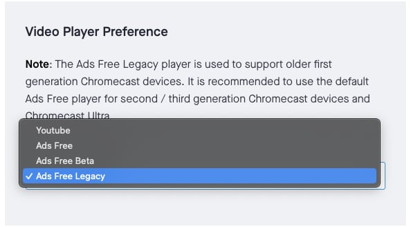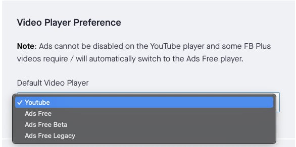 You can update your profile to toggle between the Ads Free Player (both legacy and beta) the YouTube Player. Please note that ads cannot be disabled on the YouTube player and some FB Plus videos require / will automatically switch to the Ads Free player as needed. This option can helpful if you are casting to a SmartTV or device does not support Chromecast or Airplay (check the FB Plus player requirements). This setting can also be changed at anytime.