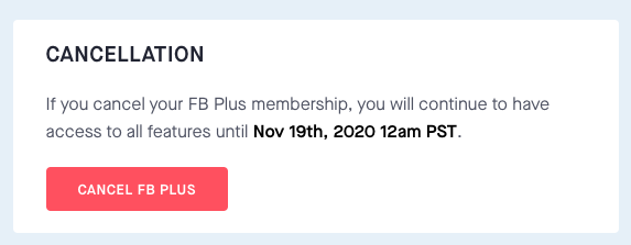 FB Plus access will automatically end on the end date on your account page. If you need to cancel before then, please reach out to support. Please note that FB Plus passes are non-refundable.
